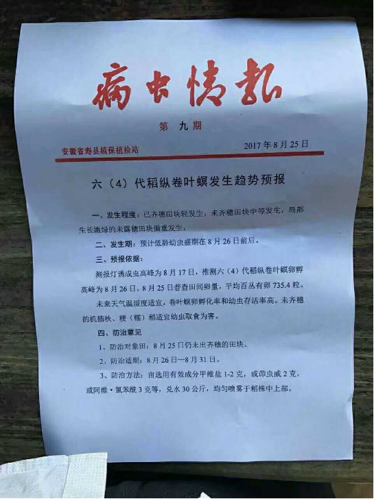 預(yù)報(bào)依據(jù):1、當(dāng)前田間蛾量及幼蟲量普遍較低,我中心在姚李鎮(zhèn)漫山紅村、團(tuán)三村,洪集鎮(zhèn)劉倉(cāng)房村、金星村等鄉(xiāng)鎮(zhèn)街調(diào)查平均畝蛾量26頭,最高達(dá)81頭。截至目前,稻縱卷葉螟遷入峰次不明顯,遷入蛾量低。2、我區(qū)單季稻以雜交稻為主,目前普遍處于分蘗期,營(yíng)養(yǎng)條件好,有利于稻縱卷葉螟取食為害。3、據(jù)氣象部門預(yù)報(bào), 2017年盛夏(7-8月)我區(qū)降水量較常年偏多,暴雨日數(shù)較常年偏多。全區(qū)盛夏平均氣溫較常年偏高,高溫日數(shù)較常年偏多。氣候條件有利于南方蟲源的不斷遷入和本地蟲源的增殖為害。