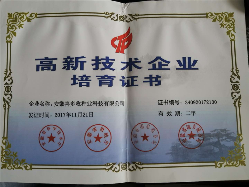 | 高新企業(yè)技術(shù)培育證書 | 2017年 | 安徽省科學技術(shù)廳 |