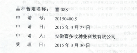 喜08S品種權(quán)申請(qǐng)受理通知書