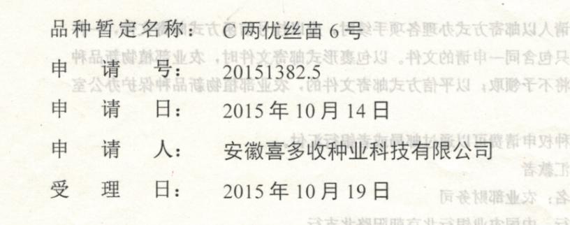 C兩優(yōu)絲苗6號(hào)品種權(quán)申請(qǐng)受理通知書