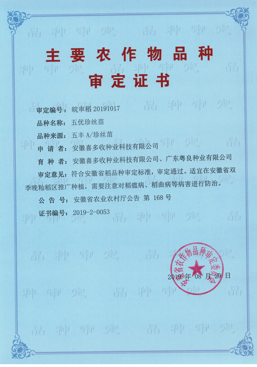 五優(yōu)珍絲苗審定證書