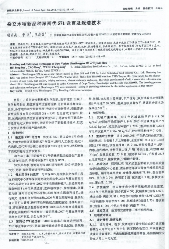 “雜交水稻新品種深兩優(yōu)571選育及栽培技術(shù)”在《安徽農(nóng)業(yè)科學(xué)》2016年第18期公開發(fā)表