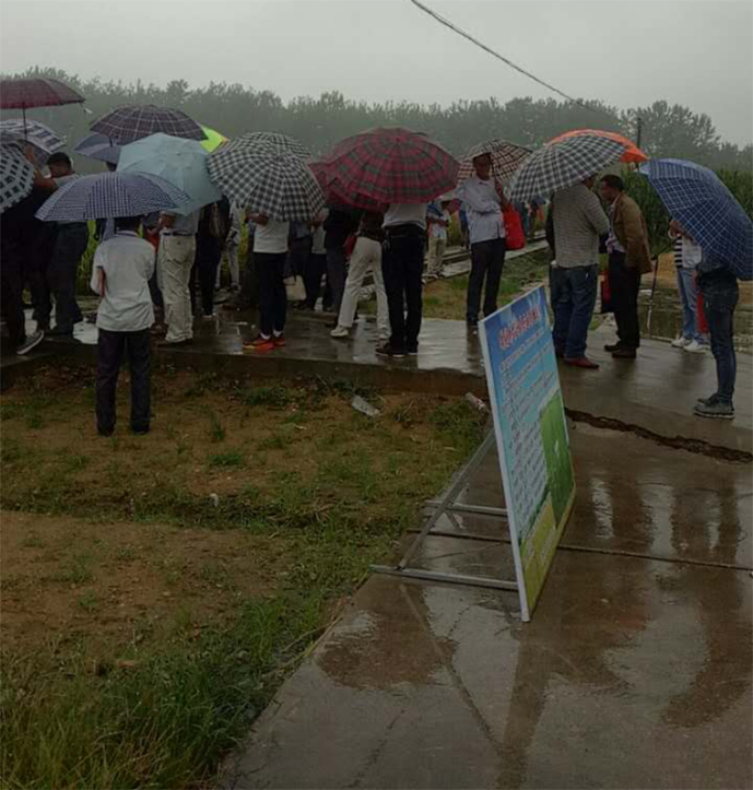2017年8月31日上午,來(lái)自裕安區(qū)15個(gè)鄉(xiāng)鎮(zhèn)參加裕安區(qū)農(nóng)業(yè)推廣中心組織的新型職業(yè)農(nóng)民(種植業(yè)班)學(xué)習(xí)培訓(xùn)的種糧大戶(hù),冒雨參觀了位于金安區(qū)稻麥良種場(chǎng)的“六安市水稻新品種展示(示范)區(qū)”暨安徽喜多收種業(yè)試驗(yàn)示范基地。安徽喜多收種業(yè)科技有限公司副總經(jīng)理趙見(jiàn)朝親自接待參觀者,技術(shù)總監(jiān)高級(jí)農(nóng)藝師曹洪現(xiàn)場(chǎng)詳細(xì)介紹了展示品種的特征特性,種糧大戶(hù)一邊聽(tīng)講解,一邊現(xiàn)場(chǎng)觀摩見(jiàn)證,種糧大戶(hù)們對(duì)親眼所見(jiàn)的“深兩優(yōu)571、C兩優(yōu)198、裕兩優(yōu)華占”等水稻新品種在今年持續(xù)高溫?zé)岷投啻未箫L(fēng)襲擊下所表現(xiàn)出的耐高溫性、抗倒性和豐產(chǎn)性表示十分滿(mǎn)意。對(duì)自己的家鄉(xiāng)能夠自主培育出如此眾多的優(yōu)質(zhì)、高產(chǎn)、多抗、廣適的水稻新品種感到由衷的自豪!