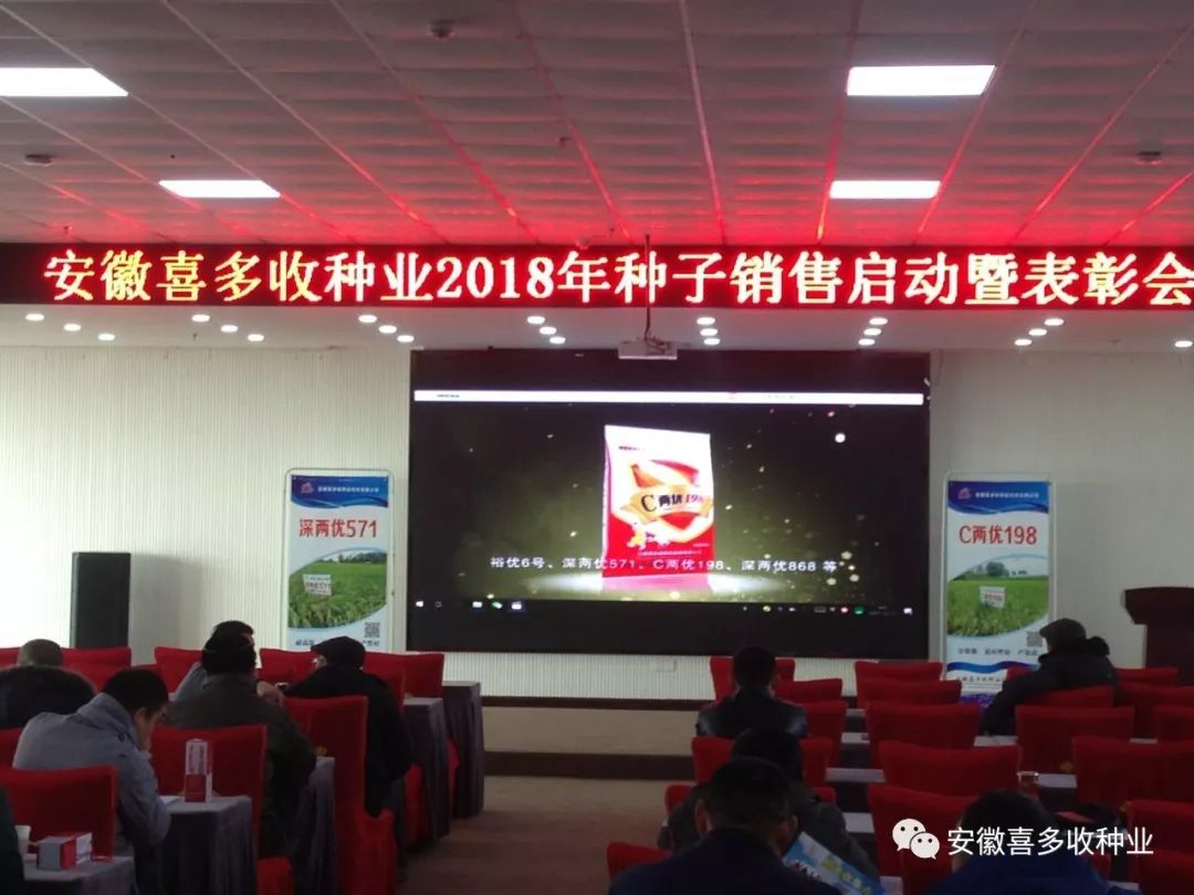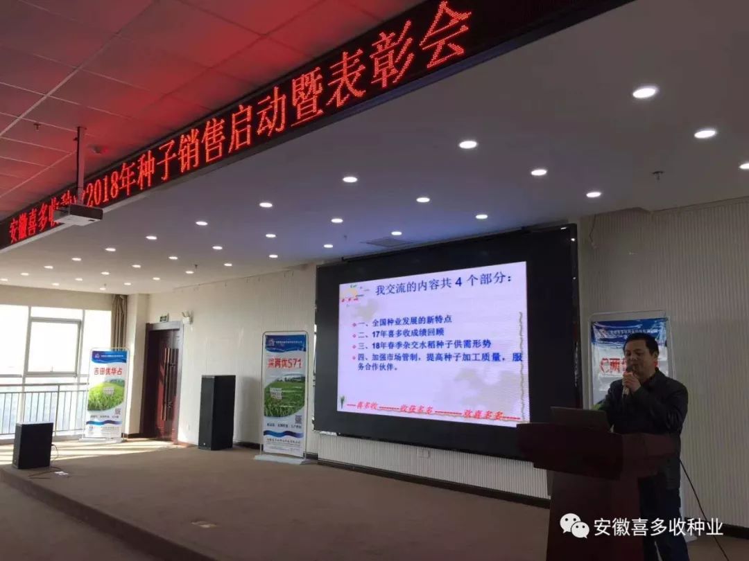 公司本著以質(zhì)量求生存,以創(chuàng)新謀發(fā)展的經(jīng)營理念,充分發(fā)揮地域優(yōu)勢(shì),努力為六安農(nóng)民朋友持續(xù)供應(yīng)優(yōu)質(zhì)良種。在此基礎(chǔ)上公司自主科研創(chuàng)新得到長(zhǎng)足的進(jìn)步,一大批自主選育的新品種先后通過各級(jí)審定,其中有優(yōu)質(zhì)抗倒的深兩優(yōu)571,高產(chǎn)多抗的C兩優(yōu)198,在經(jīng)過農(nóng)戶的廣泛種植后,深得廣大農(nóng)戶喜愛,為農(nóng)戶增產(chǎn)增效做出應(yīng)有貢獻(xiàn);公司將不遺余力繼續(xù)推進(jìn)科研創(chuàng)新及新品種選育步伐,目前公司自主選育的喜兩優(yōu)絲苗、巧兩優(yōu)絲苗、喜兩優(yōu)超占、深兩優(yōu)276、深兩優(yōu)2688、裕兩優(yōu)華占等一大批高產(chǎn)、優(yōu)質(zhì)、多抗的新組合陸續(xù)進(jìn)入各級(jí)區(qū)試,它們的育成將會(huì)更大的提高安徽喜多收種業(yè)的服務(wù)能力,為廣大農(nóng)民朋友節(jié)本增效、增加收益做出更大貢獻(xiàn)。 會(huì)上,安徽喜多收種業(yè)有限公司董事長(zhǎng)胡宗兵先生對(duì)大會(huì)做了主旨發(fā)言。首先,胡總對(duì)中國種業(yè)發(fā)展和新特點(diǎn)、新形勢(shì)和與會(huì)者做了交流,在面對(duì)千家萬戶的種企、琳瑯滿目的品種,希望大家擦亮眼睛選擇負(fù)責(zé)任的種業(yè)企業(yè)、選擇穩(wěn)產(chǎn)高產(chǎn)的品種深度合作;其次,胡總向大家介紹了喜多收種業(yè)在2017年的發(fā)展成績(jī),這一年里安徽喜多收種業(yè)成功設(shè)立了安徽喜多收種業(yè)合肥分公司、裕安區(qū)喜多收種業(yè)科技有限公司等兩家分支機(jī)構(gòu),更好的服務(wù)大眾;在科研上2017年公司的深兩優(yōu)868通過安徽省審定,40多個(gè)新組合成功進(jìn)入各級(jí)區(qū)試;多個(gè)品種榮獲各級(jí)主管部門的科研、創(chuàng)新、發(fā)明獎(jiǎng)勵(lì)。第三、胡總向大家介紹了2018年春季雜交水稻種子的供需形勢(shì),2017年是個(gè)多災(zāi)的年份,嚴(yán)峻的氣候狀況不僅考驗(yàn)了糧食的大田生產(chǎn),更加考驗(yàn)了種子生產(chǎn)。多省的生產(chǎn)基地受到災(zāi)害性氣候侵襲,造成減產(chǎn)、質(zhì)量下降,提醒廣大用戶要選好種。最后,胡總向大家介紹了目前喜多收的種源情況、種子質(zhì)量狀況、市場(chǎng)管理措施等問題,保證以優(yōu)質(zhì)的種子為大家提供更好的服務(wù)。